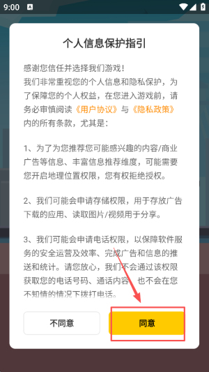 1、首先,阅读并同意个人信息保护指引,点击“同意”按钮以进入游戏。