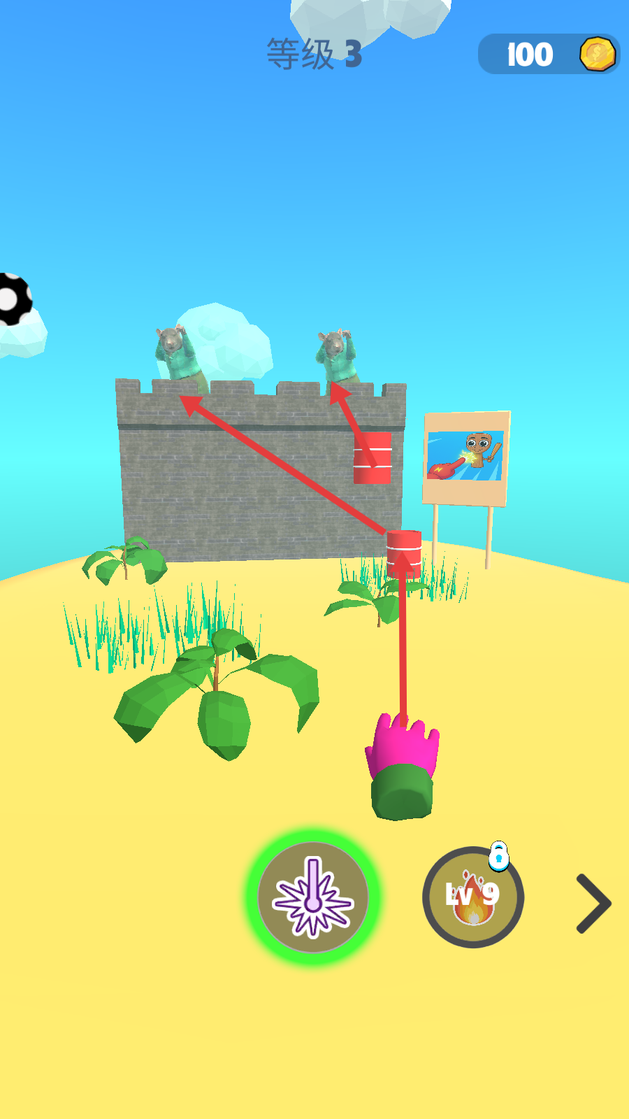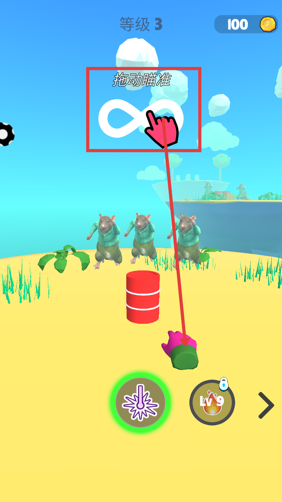1、在【等级-3】,根据【拖动瞄准】提示,拖动绿色道具,瞄准红色油桶或老鼠,准备发起攻击。
