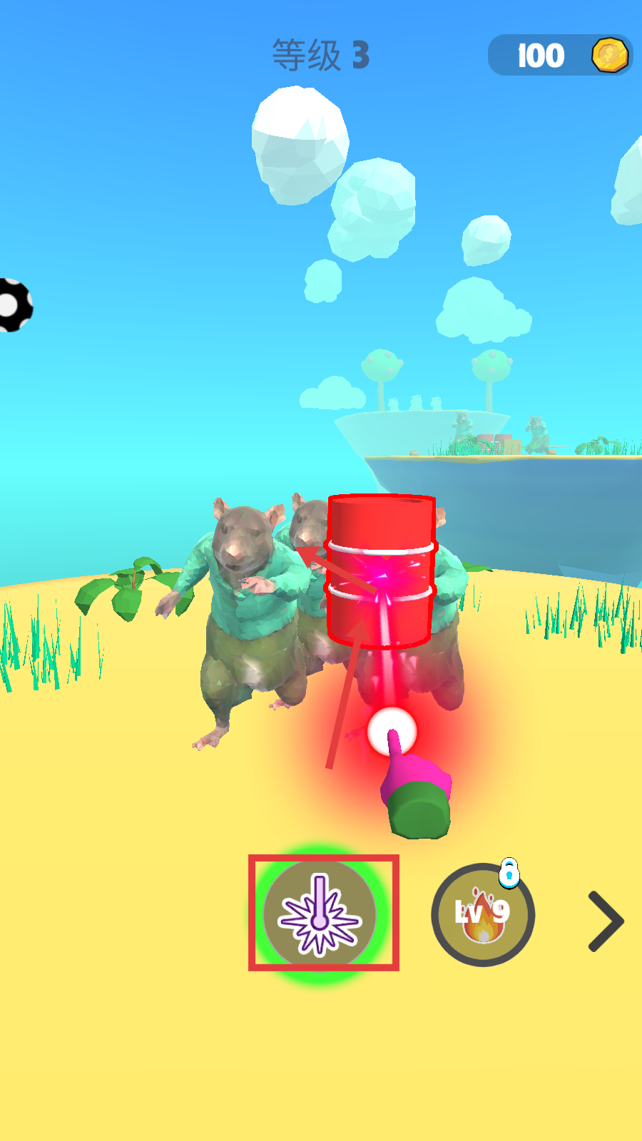 2、瞄准红色油桶后,点击下方技能按钮,释放技能,借助油桶爆炸的威力,攻击周围的老鼠。