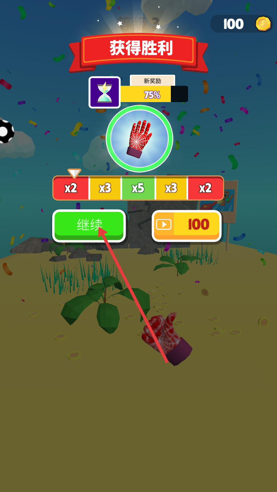 4、成功通关后,屏幕显示【获得胜利】,可领取蜘蛛手套等奖励,点击【继续】按钮进入下一关。