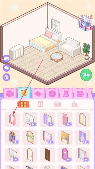 3、切换到门窗栏,选粉色拱形窗,放置在房间墙壁合适处。