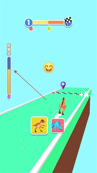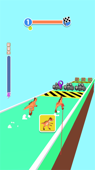 1、在赛道上操控恐龙前进,遇到障碍物时,可点击下方恐龙图标切换恐龙,利用不同恐龙能力躲避,同时留意左侧能量条。