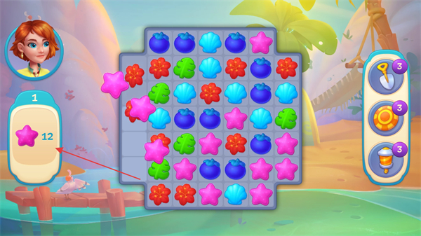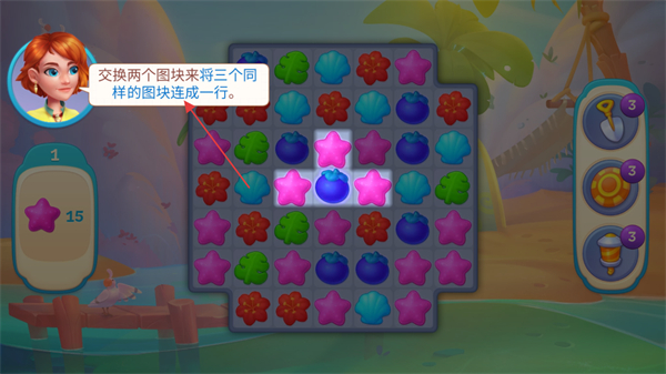 1、根据提示,交换两个图块,使三个同样的图块连成一行进行消除,留意左侧目标粉色星星15个。