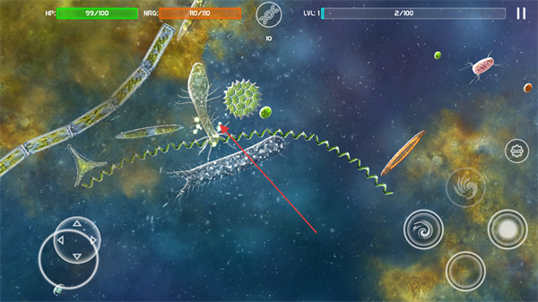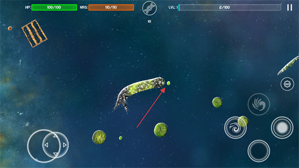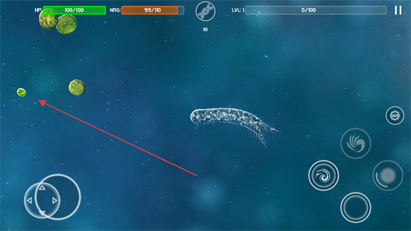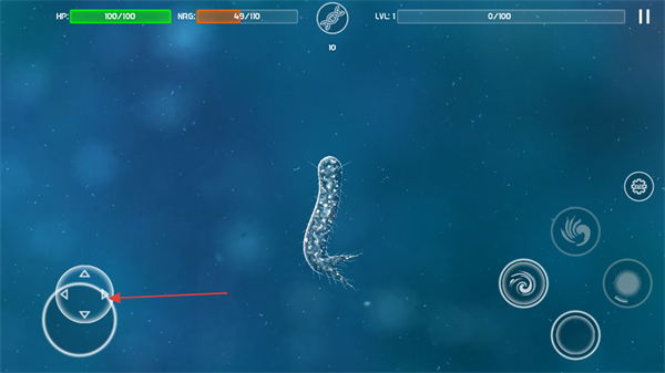 1、进入游戏界面,通过左下角虚拟按键操控微生物移动,留意上方HP生命值和ENER能量值。