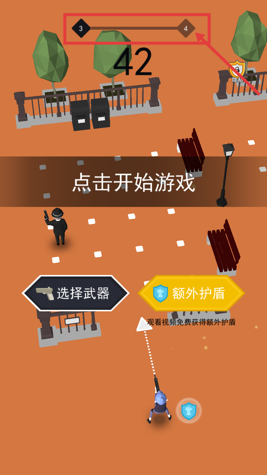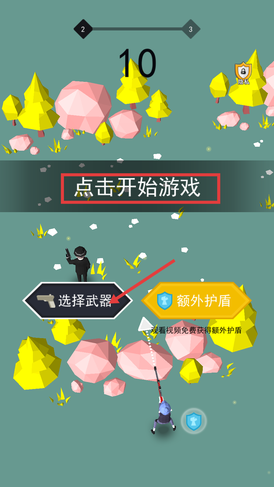1、点击【开始游戏】前,可选择【武器】,也能观看视频获取【额外护盾】,提前为闯关做准备。