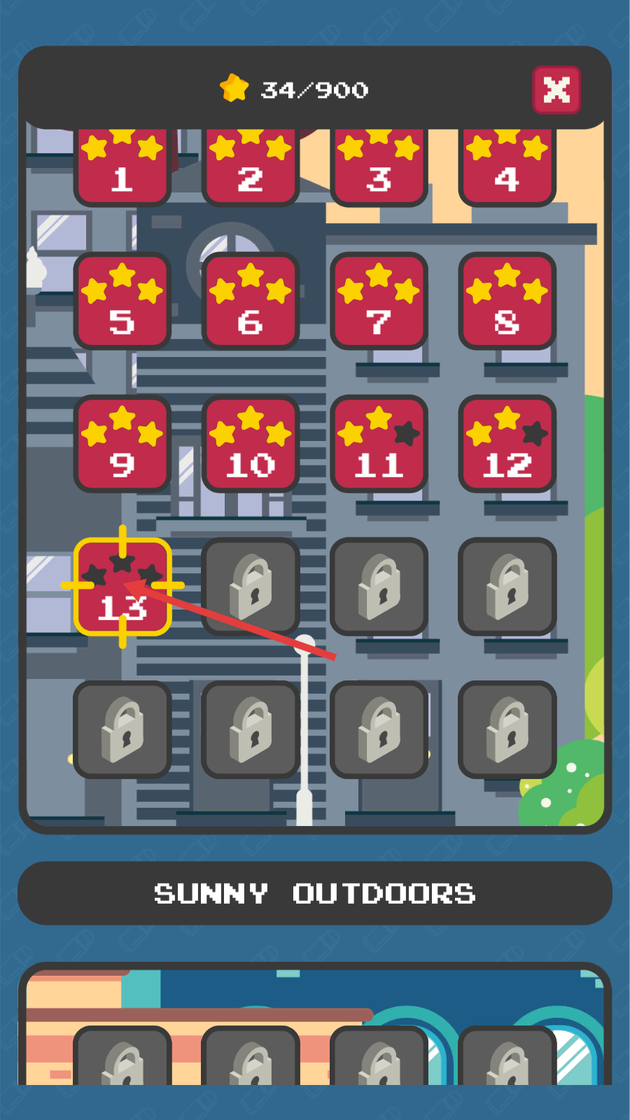 1、在关卡选择界面,选择标有黑色星星的【13】号关卡,该关卡属于【SUNNY-OUTDOORS】场景,点击进入开始挑战。