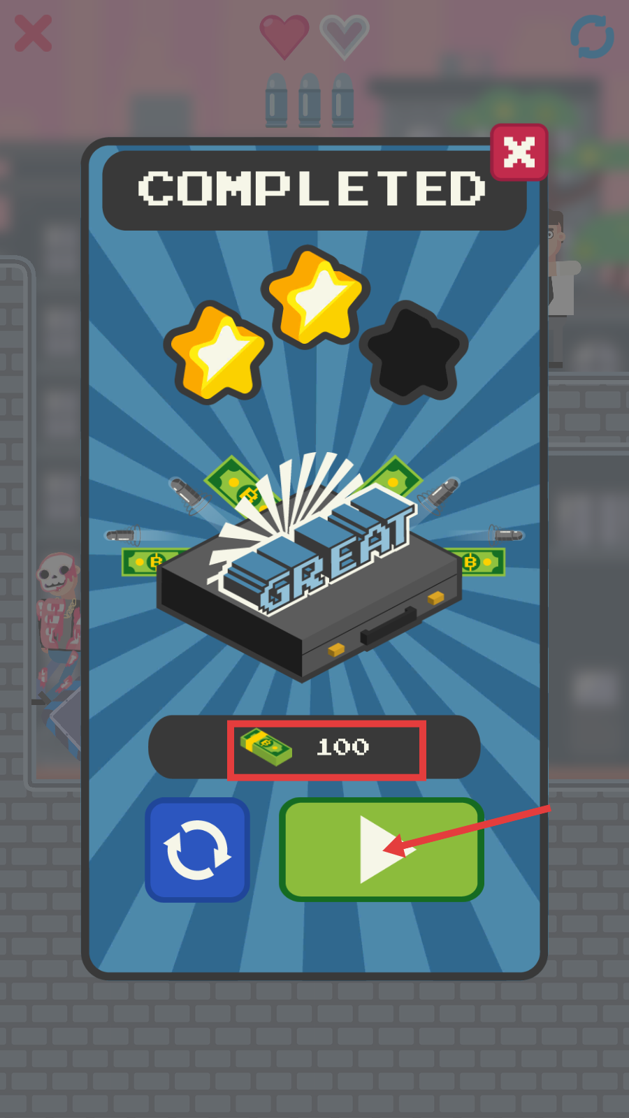 4、成功完成关卡后,界面显示【COMPLETED】,可获得【100】货币奖励,点击绿色箭头按钮进入下一关继续挑战。