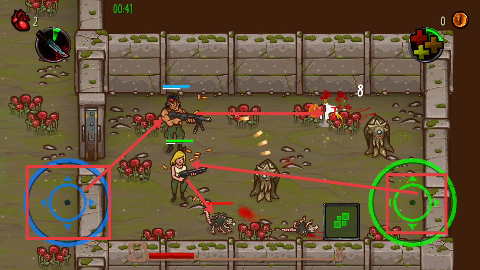 2、战斗过程中,通过左侧虚拟按键移动角色,右侧按键操控攻击,与队友配合射击敌人,推进战斗进程。