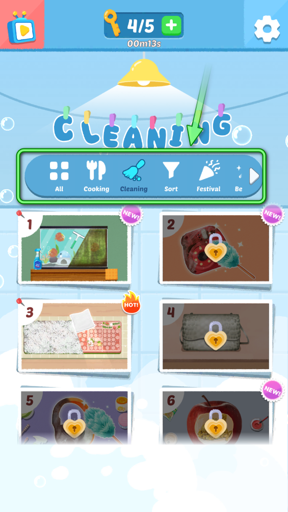 1.进入游戏后,我们可以自由的去选择关卡,上方还有不同类别,例如烹饪、清洁等等。