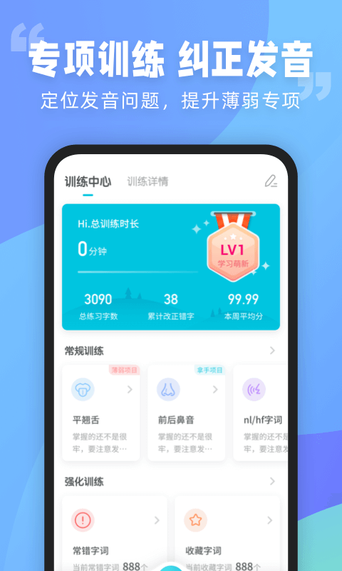 普通话测试APP功能,纠正发音巩固练习,提高普通话学习效率。
