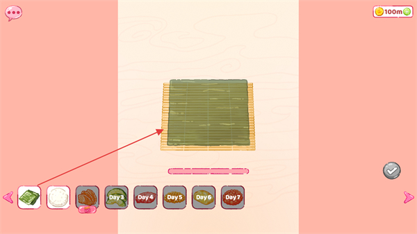 1、进入游戏,点击下方食材栏中的海苔,放置到竹帘上开始制作寿司。