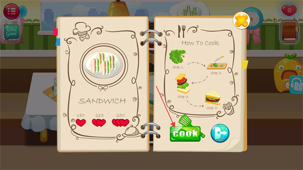 2、查看菜谱,了解制作SANDWICH的步骤后点击COOK按钮开始制作。