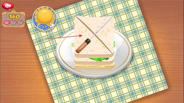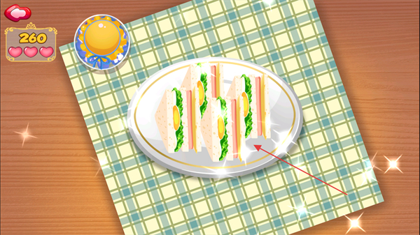4、完成切割,做出摆盘好看的三明治,获取分数如260,上菜给顾客。