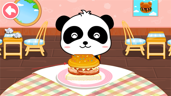 4、将制作好的汉堡呈现给熊猫角色,让它享用,完成一次美食制作任务。