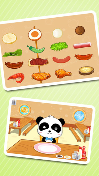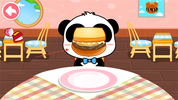 1、进入餐厅场景,看到可爱的熊猫角色,准备为它制作汉堡。