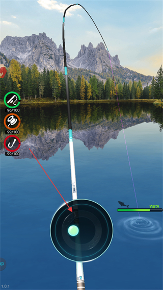 2、当鱼咬钩后,留意屏幕左侧的数值条,按提示操作下方的轮盘,控制鱼线收放,避免鱼逃脱。