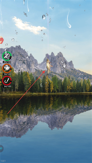 1、进入游戏,在美丽的山水场景中,点击水面确定钓鱼位置,抛出鱼钩。