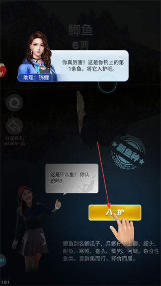 4、钓起鱼后,查看鱼的信息,如钓到鲫鱼6两,点击入护按钮,将鱼收入鱼护,完成一次钓鱼操作。