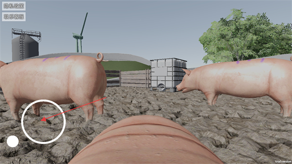 1、进入游戏,通过屏幕左下角的虚拟摇杆控制小猪移动,在泥土地场景中探索周围环境。