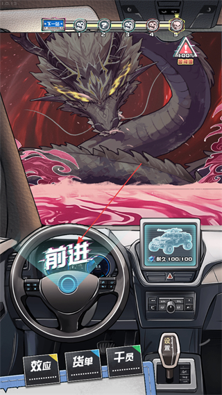 1、点击前进按钮开车上路,遭遇强大怪物如龙形怪物时,观察怪物攻击节奏。