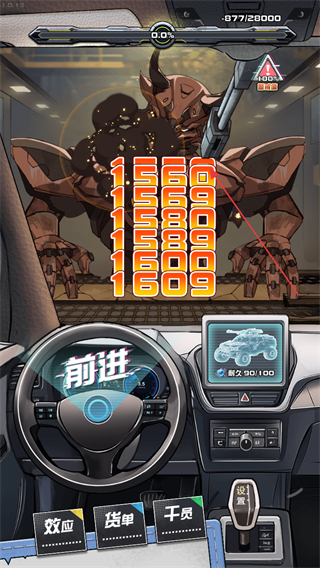 2、留意屏幕上方的血量条如耐久100/100,若怪物攻击,及时点击屏幕反击,避免车辆耐久降低过多。