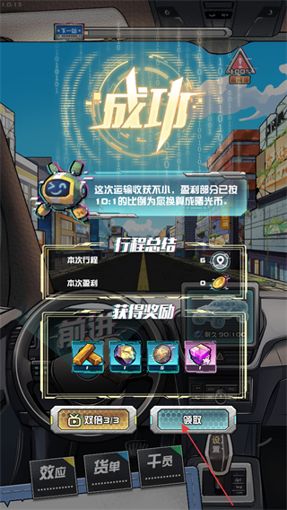 4、成功抵达目的地,看到成功提示后,点击领取按钮,获取奖励,用于升级车辆和装备。