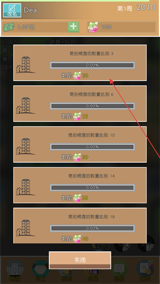 1、查看任务界面,了解任务目标,如竞拍楼盘的数量达到3,明确努力方向。