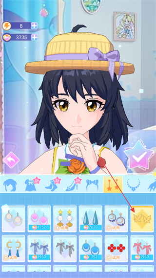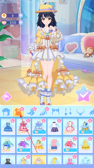 1、进入游戏换装界面,查看左侧的等级8和货币数量3735,点击下方服装分类中的衣服,给角色试穿。