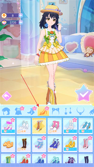 4、完成服装、鞋子、饰品等搭配后,点击右侧的√图标,确认当前的换装效果。