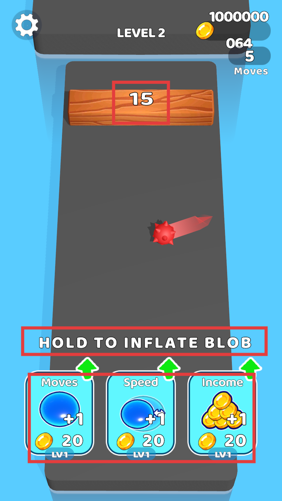 1、进入Level2后,长按屏幕触发【HOLD-TO-INFLATE-BLOB】,同时可花费20金币升级【Moves】【Speed】【Income】,提升blob能力。