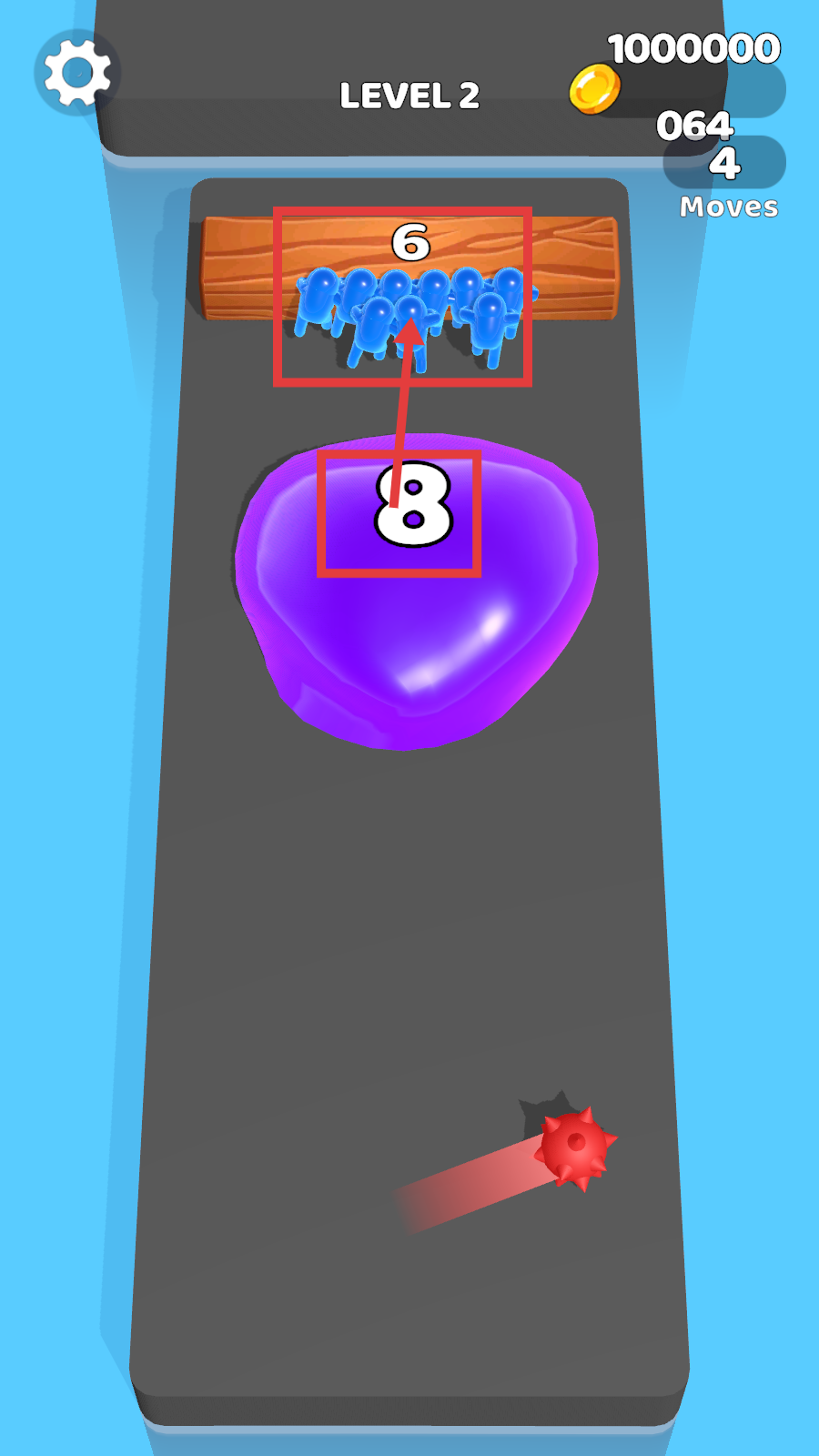 2、操控紫色blob(数值8)撞击前方数值为6的蓝色小人,利用数值优势合并小人,逐步壮大blob群体,推进关卡进程。