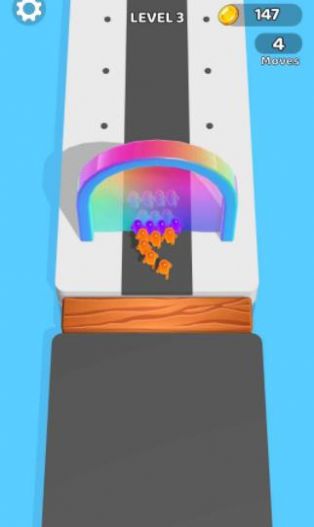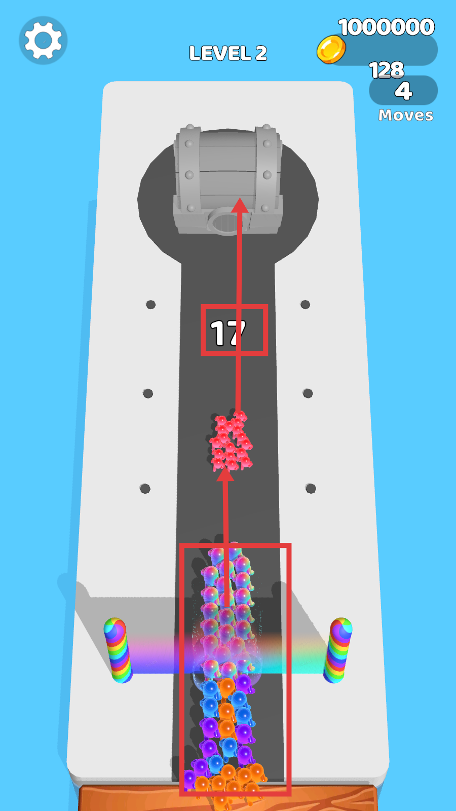 3、合并后的彩色小人队伍朝着宝箱移动,借助数值17的规模优势,引导小人向目标宝箱前进,争取顺利送达。