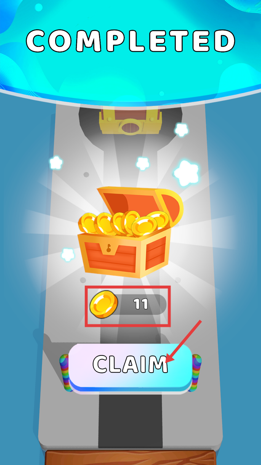 4、成功完成关卡后,界面显示【COMPLETED】,点击【CLAIM】按钮,领取11枚金币奖励,积累资源用于后续关卡。