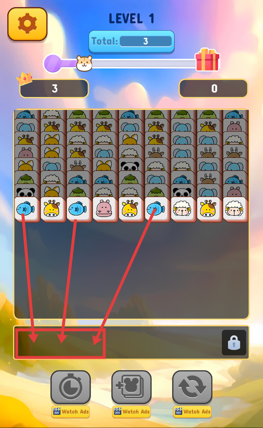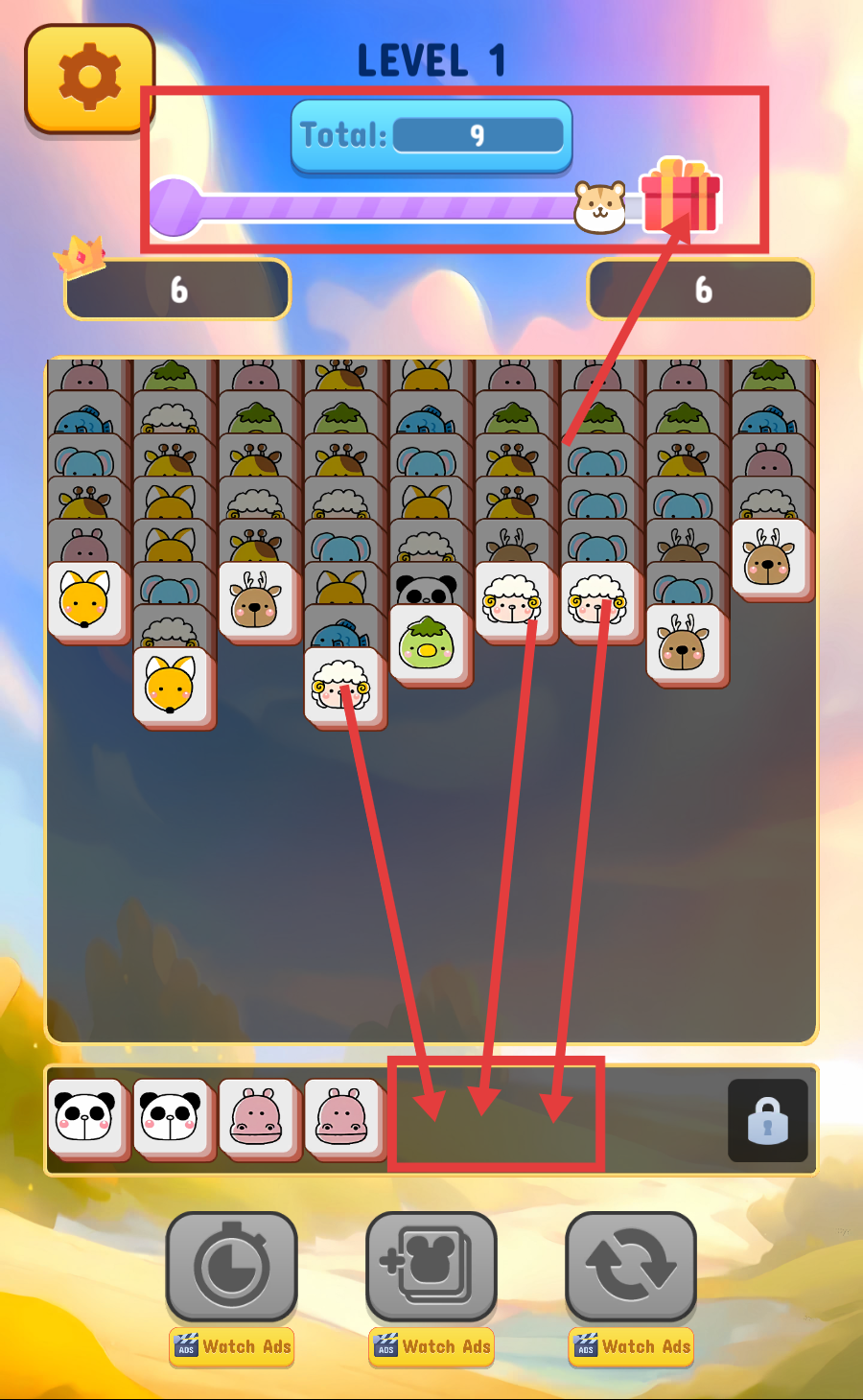 3、持续匹配相同动物瓷砖,积累进度(如使Total数值提升),当进度条接近礼物图标时,可获取奖励,推进关卡进程。