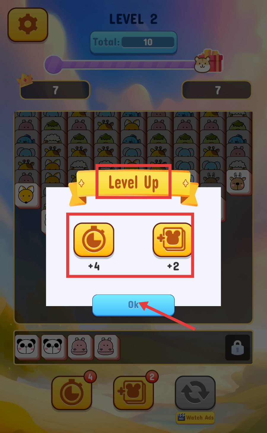 4、完成Level1后,界面弹出【LevelUp】提示,点击蓝色【Ok】按钮,领取+4和+2的道具奖励,进入Level2继续挑战。