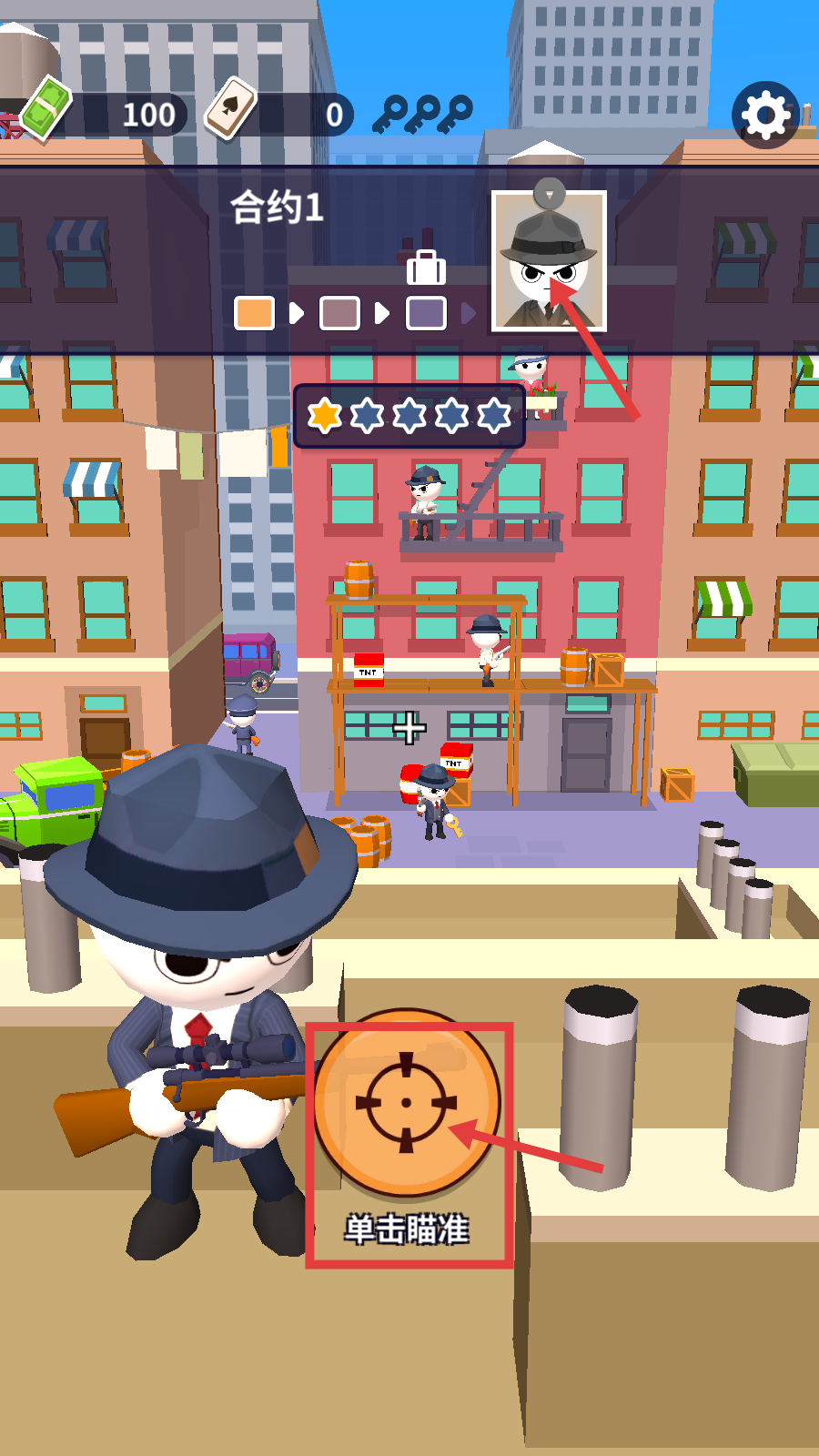 1、进入【合约1】后,点击【单击瞄准】按钮,开启瞄准模式,准备锁定场景中的目标,开启战斗流程。