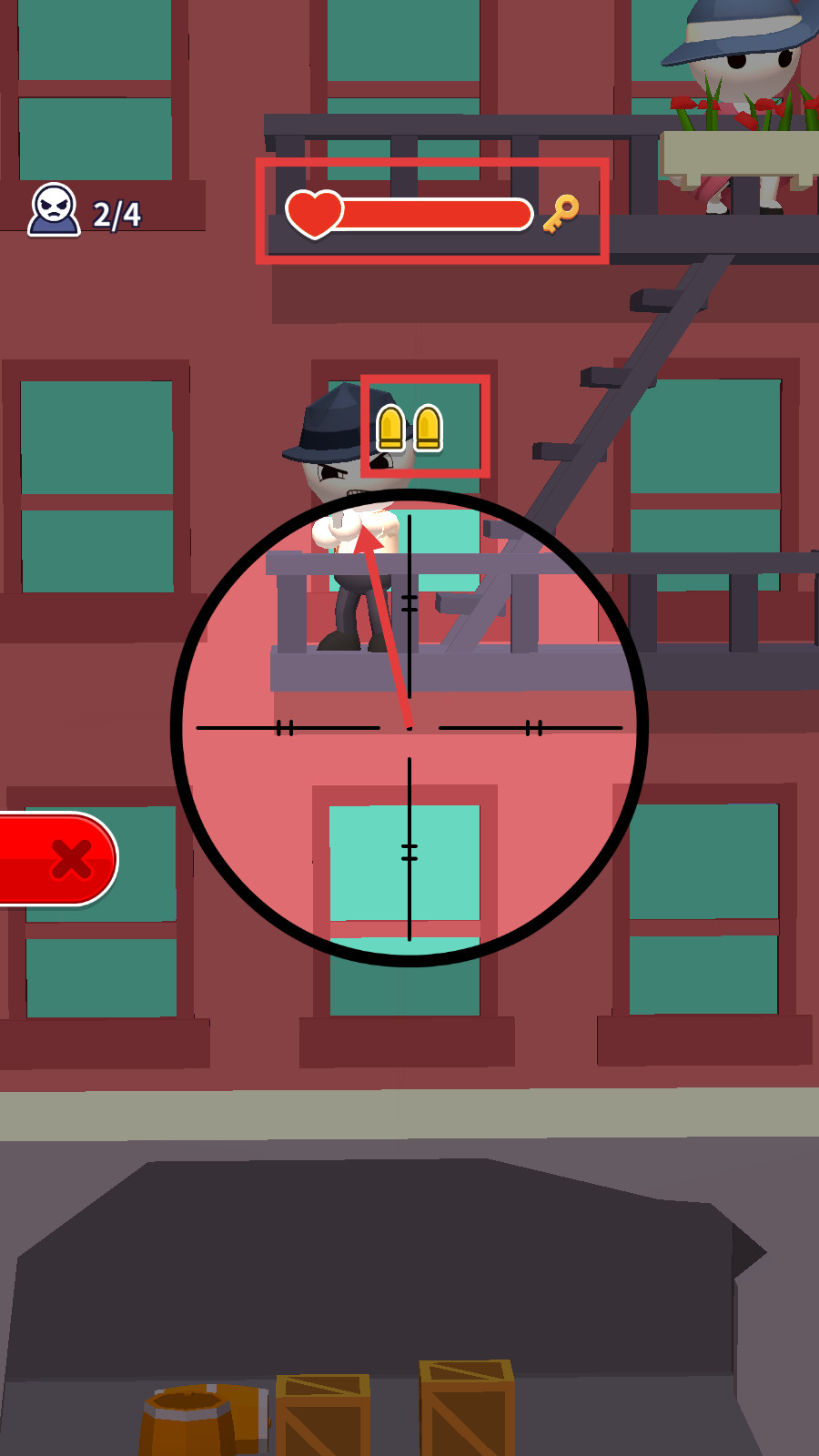 3、射击过程中,留意上方生命值与钥匙状态,同时关注剩余【子弹】数量,合理规划射击操作,持续消灭敌人以推进任务进度。