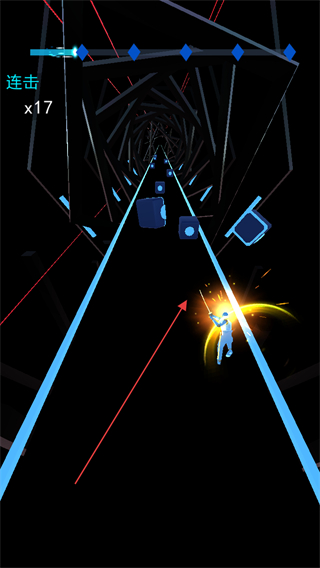 2、按照方块飞来的方向和角度,点击屏幕操控角色挥剑击打方块,获取连击数如连击x17。