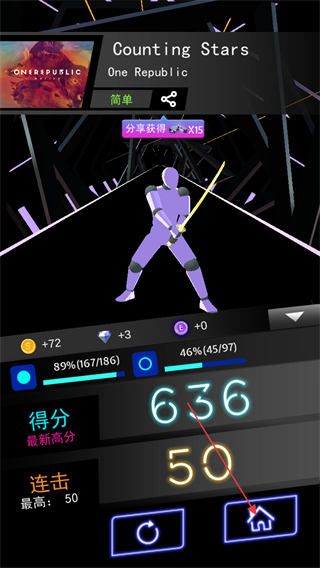 - 节奏宝剑是一款将音乐韵律与跑酷冒险巧妙结合的趣味作品,玩家将化身为装备炫酷的科幻忍者,手持特制宝剑在充满动感的赛道上前行,内不仅有丰富的音乐选择