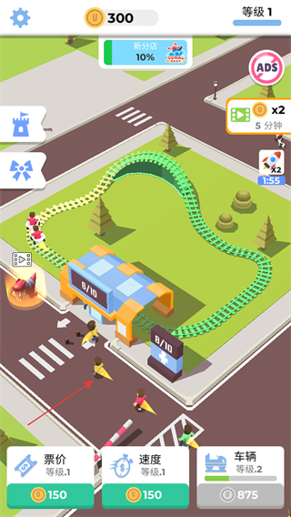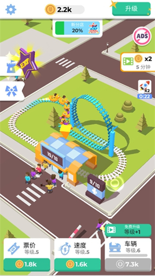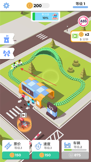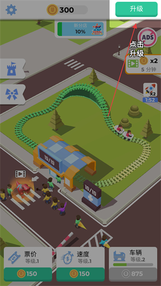 2、随着游戏进行,赚取更多金币,当有足够金币时,点击下方的票价,速度,车辆按钮进行升级升级所需金币会显示在按钮上。