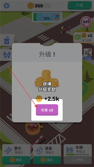 4、升级完成后,点击收集x3按钮领取升级奖励,获取更多金币,进一步发展过山车设施。