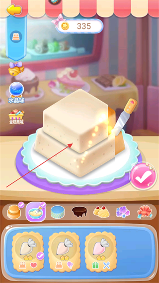 1、进入制作界面,查看屏幕上方的金币数量如335,从下方材料栏选择蛋糕胚堆叠。