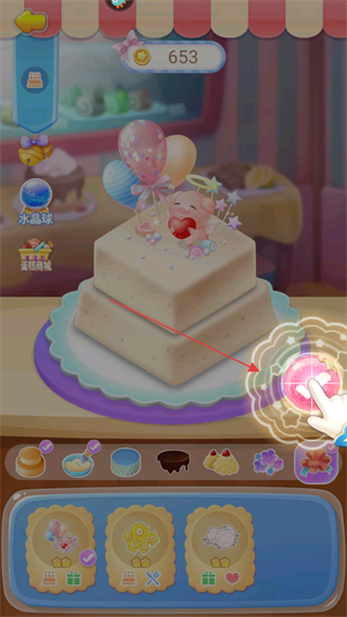 2、根据关卡要求,从材料栏选取装饰品如气球、玩偶装饰蛋糕。