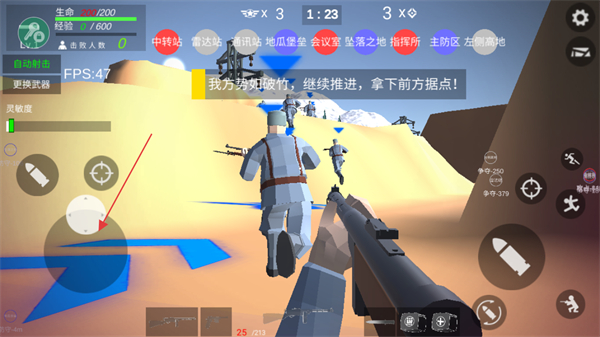 1、点击左下方移动按钮操控角色,跟随队友向前进攻。