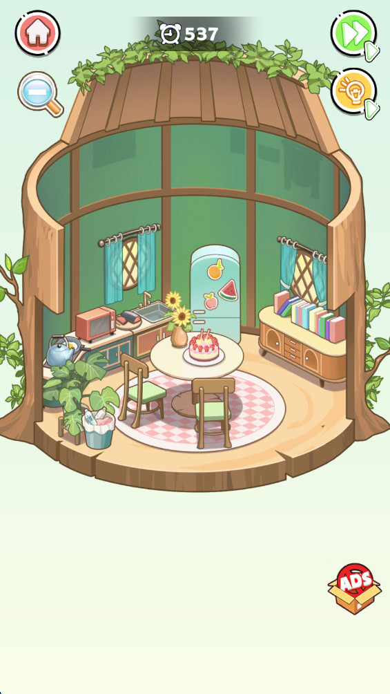1.进入关卡后,点击房间里的神秘箱子,各种家具和物品就会随机出现。