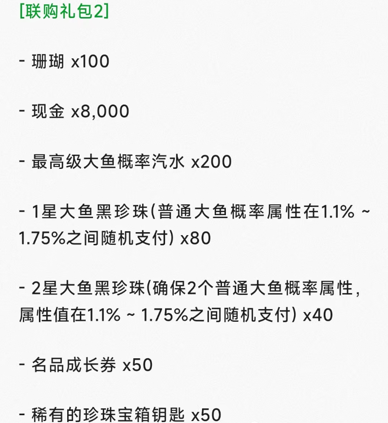 (如果是打从一开始就乱设或没经营主要珍珠的好友请直接删了,通常这类玩家是较无心经营游戏的,觉醒是很少数,我还见过放置有五条高经验加成属珍珠当主要珍珠的人才(躺)。)七.汽水(大鱼加成15%/20%/30%,效果可叠加)游戏中可用来提升大鱼概率的汽水有「大鱼概率汽水」.「高级大鱼概率汽水」.「顶级大鱼概率汽水」三种,三汽水间可相交互同时使用,以堆叠出更高的大鱼加成效果。以下为三种汽水的取得方法: