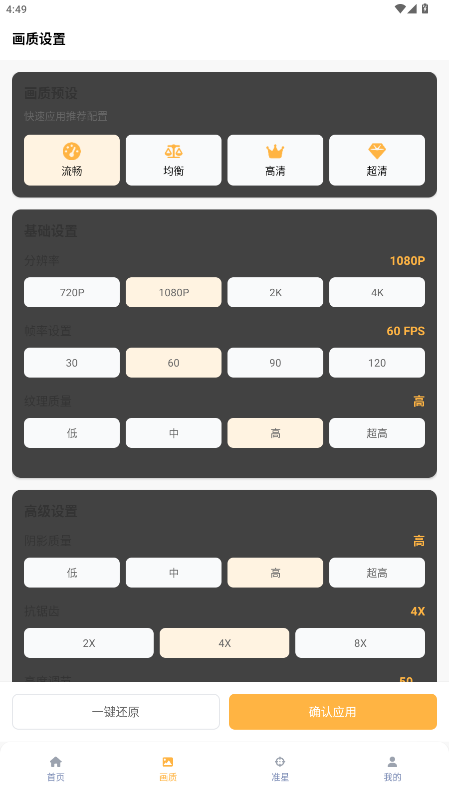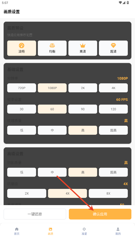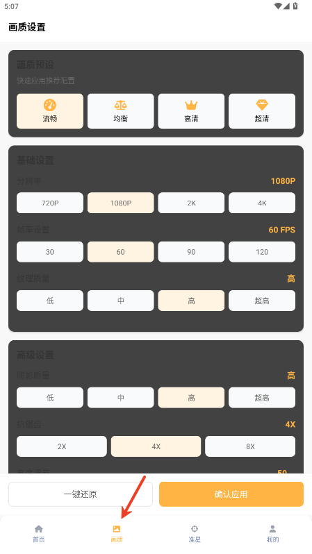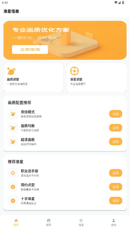 1.进入app后可以看见准星调整和画质调整两大栏