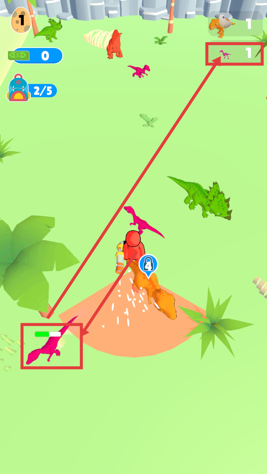 1、在恐龙区域,捕捉【粉色恐龙】,留意右上角数量提示,逐步积累,同时关注背包【2/5】的收集进度。