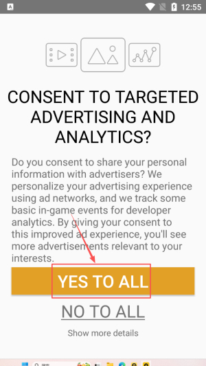 1、首先,阅读是否同意个性化广告与数据分析请求,选择“YES TO ALL”进入游戏。