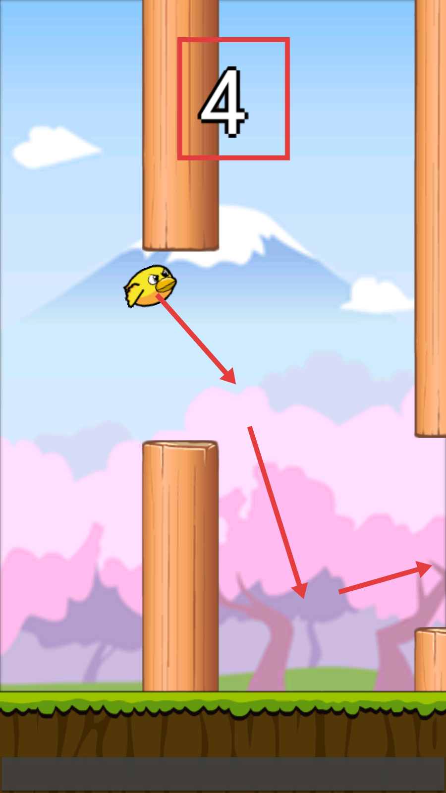 3、持续操控小鸟躲避柱子,不断突破,将分数提升至【4】分,锻炼操作技巧。